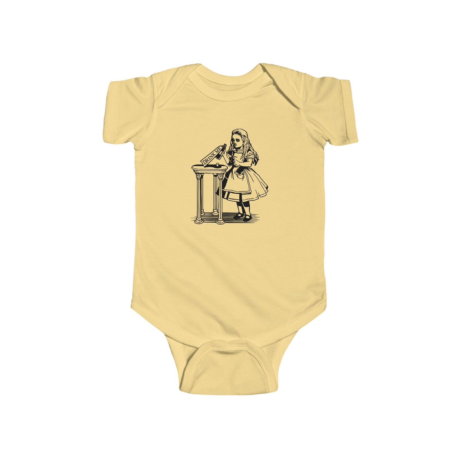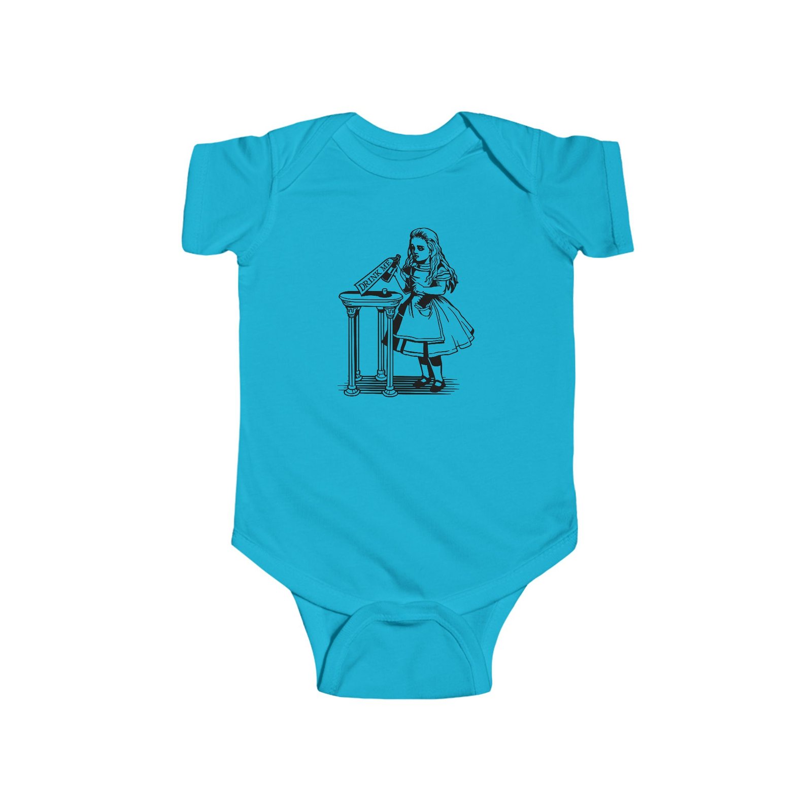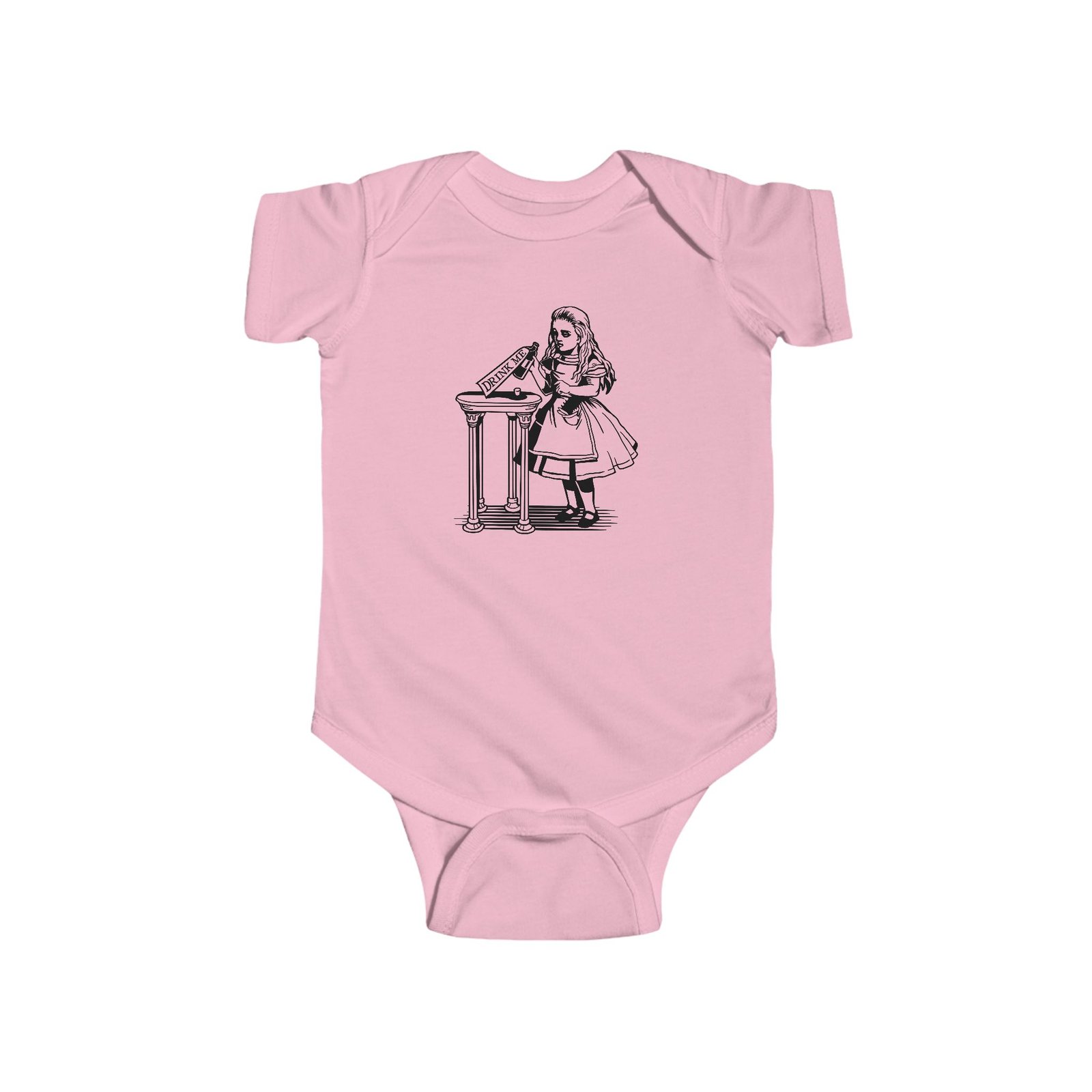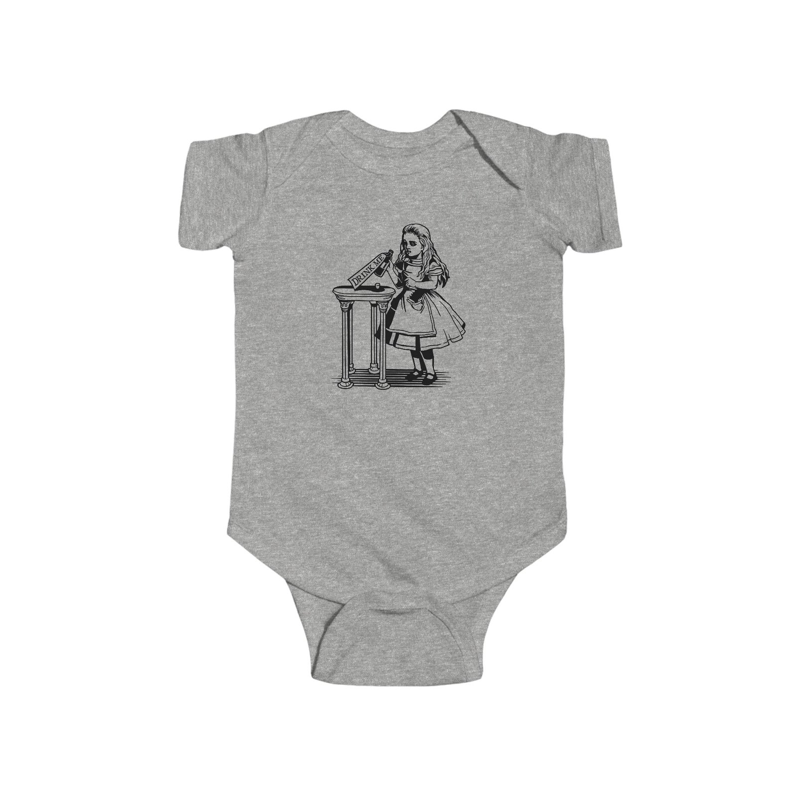 drink me baby bodysuit, alice in wonderland baby clothes, vintage baby outfit, literary baby gift, fine jersey infant onesie, classic story baby clothes, baby shower gift, alice themed baby bodysuit, whimsical baby outfit, infant wonderland clothes, book lover baby gift, fantasy baby fashion, storybook baby onesie, baby classic literature outfit